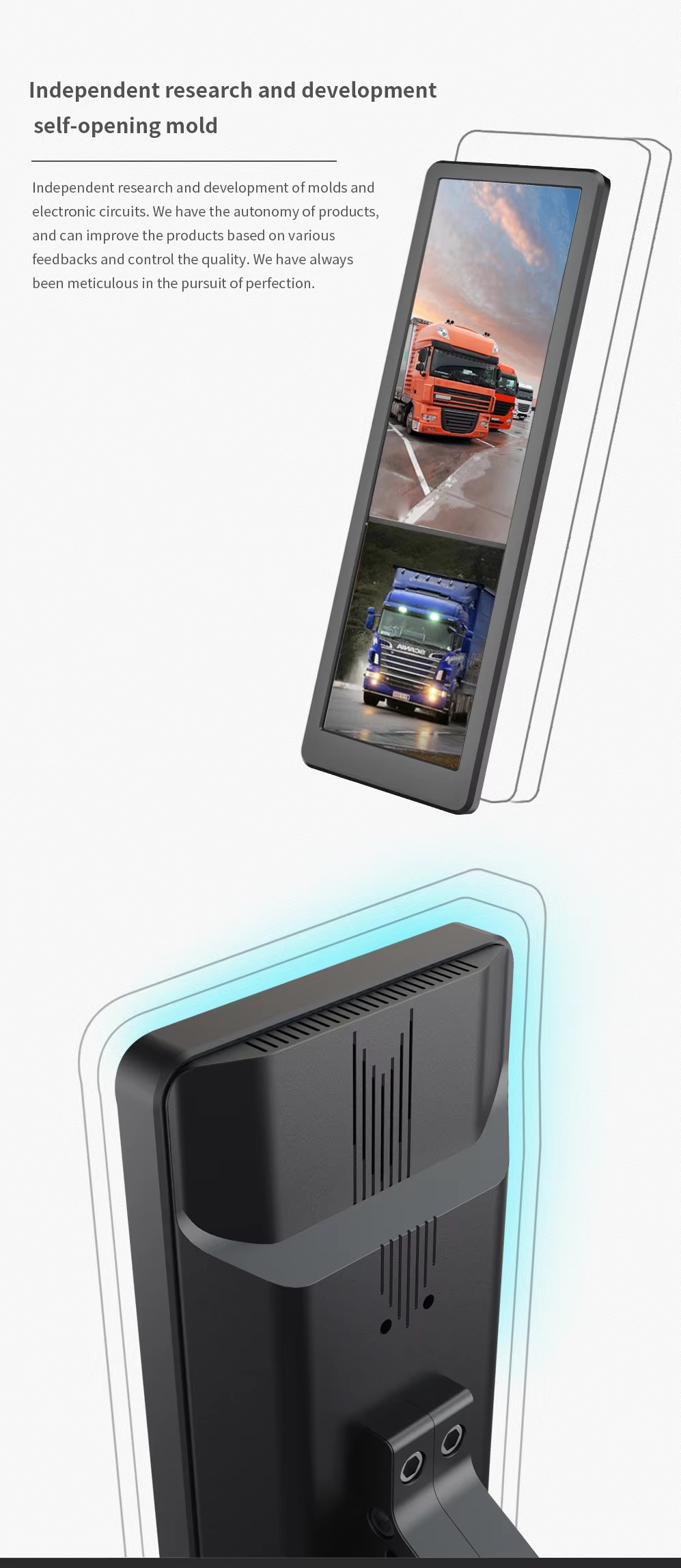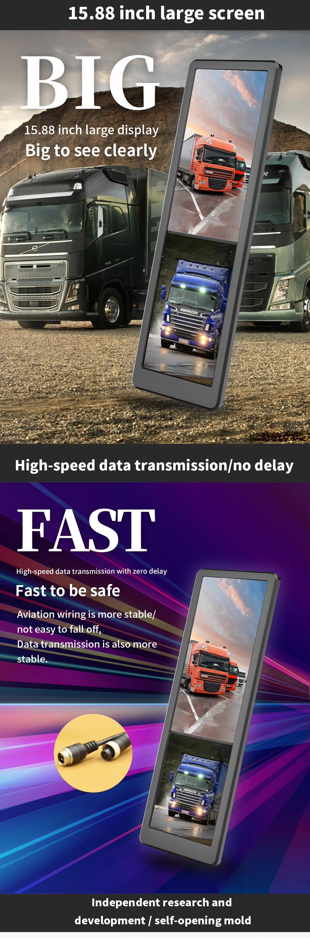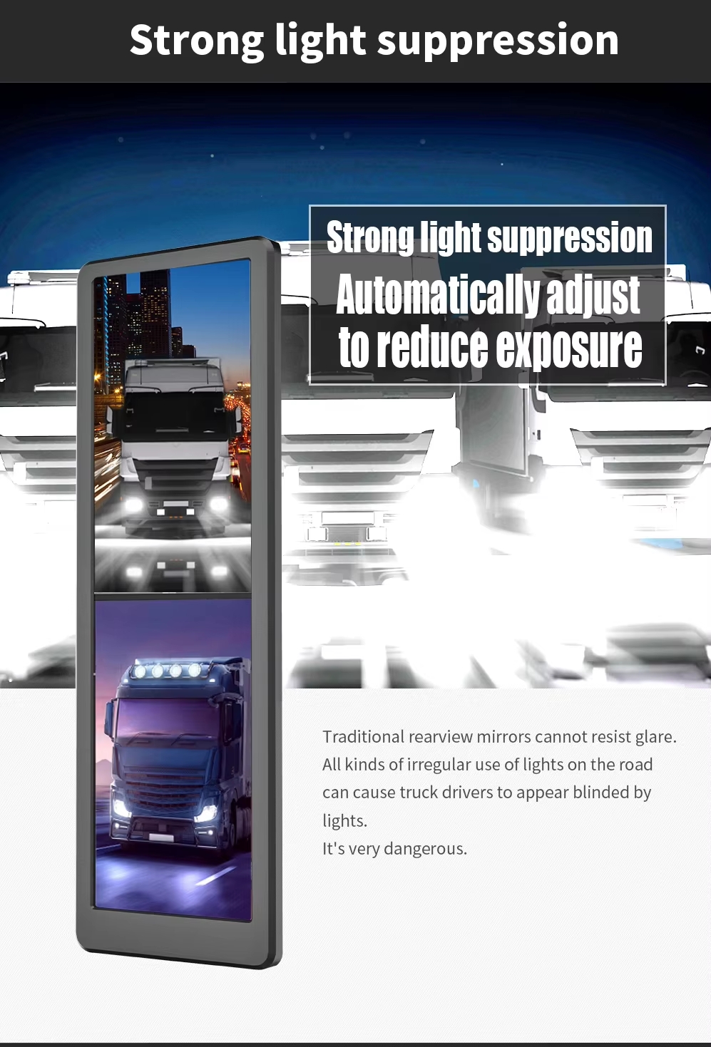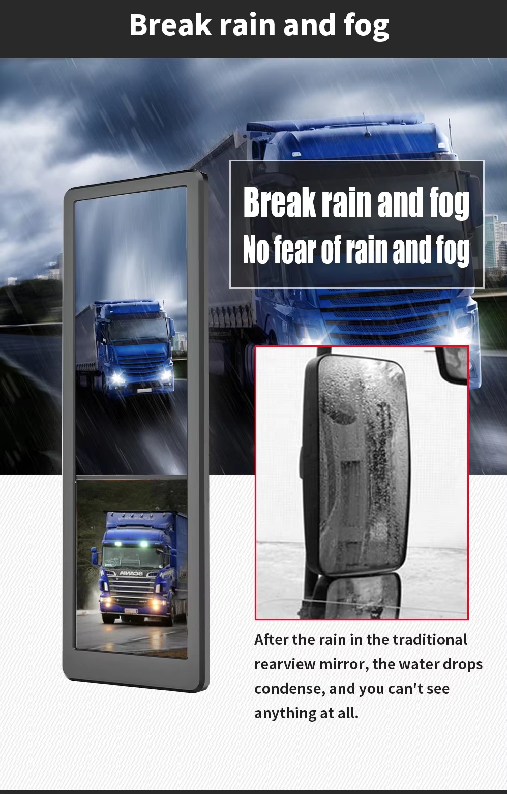 15.88inch E-Side Mirror System is designed for replacing traditional rearview mirror. The system collectes image from dual lenscamera mounted left/right side of the vehicle, and inputs the image signal of the road conditions to the 15.88 inch screen fixed on the A-pillar inside the vehicle, and then display on the screen.